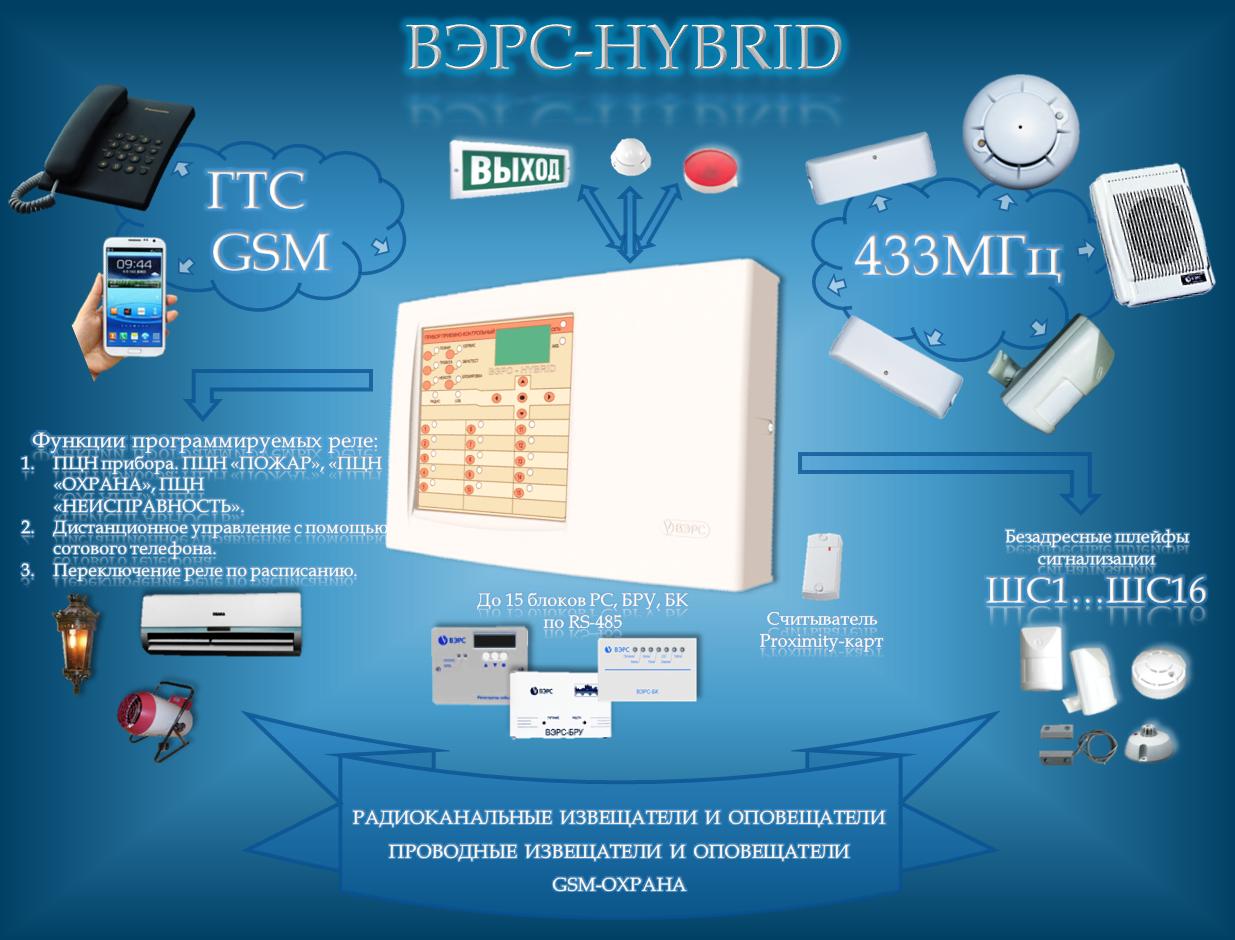 - Прибор приемно-контрольный и управления охранно-пожарный ВЭРС-HYBRID, сочетающий в себе возможность работы как с проводными неадресными пороговыми ШС, так и с адресными радиоканальными устройствами.