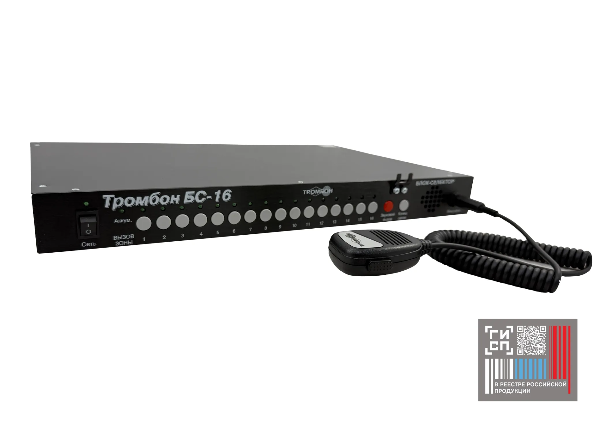 Блок селектора предназначен для обеспечения двухсторонней речевой связи между постом-диспетчерской и зонами пожарного оповещения. Устройство селектора состоит из блока селектора у диспетчера и вызывных панелей в зонах оповещения. Снабжен микрофоном-тангентой. Блок селектора связан с вызывной панелью 4-проводной линией связи. «Тромбон - БС-16» обеспечивает питанием вызывную панель «Тромбон - ВП».