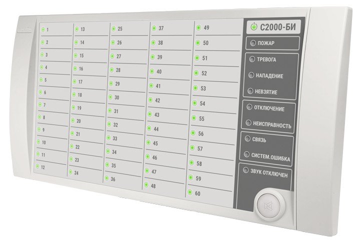 "С2000-БИ" предназначен для работы в составе ИСО "Орион" совместно с пультом контроля и управления "С2000" ("С2000М") и отображения с помощью встроенных индикаторов и звуковой сигнализации сообщений о событиях в 60 разделах системы.